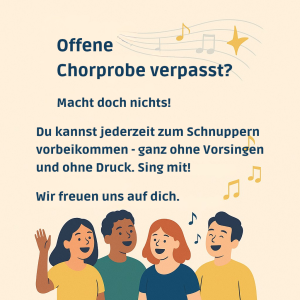 Allgemein 3. Oktober 2025 Schnuppersingen Komm gerne zum Schnuppersingen in unsere Chorprobe. Jeden Donnerstag von 20-22 Uhr im Kolpinghaus, Schwelm. Sing einfach mal mit, ganz ohne Vorsingen 😃🎶 Ist denn schon Weihnachten? Offene Chorprobe am 25. September